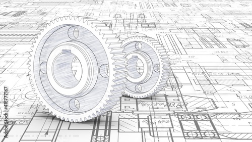 Engineering Design Of Gears Technical Drawing Rotating Mechanism Of Round Parts Machine Technology 3d Illustration Wall Mural Aliaksandr